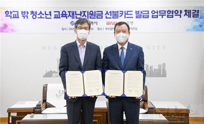 이에 앞서 어제(22일) 오후 3시에 이병진 부산시 행정부시장, 강문성 BNK부산은행 고객지원그룹장, 김광모 시의회 의원, 백진영 청소년상담복지센터장, 김진호 동구 학교밖 청소년지원센터장 등이 참석한 가운데 ‘선불카드 발급을 위한 업무협약’이 체결되었다. 이 협약에 따라 BNK부산은행은 교육재난지원금 선불카드의 무료 발급, 운영시스템 구축 등을 수행한다.