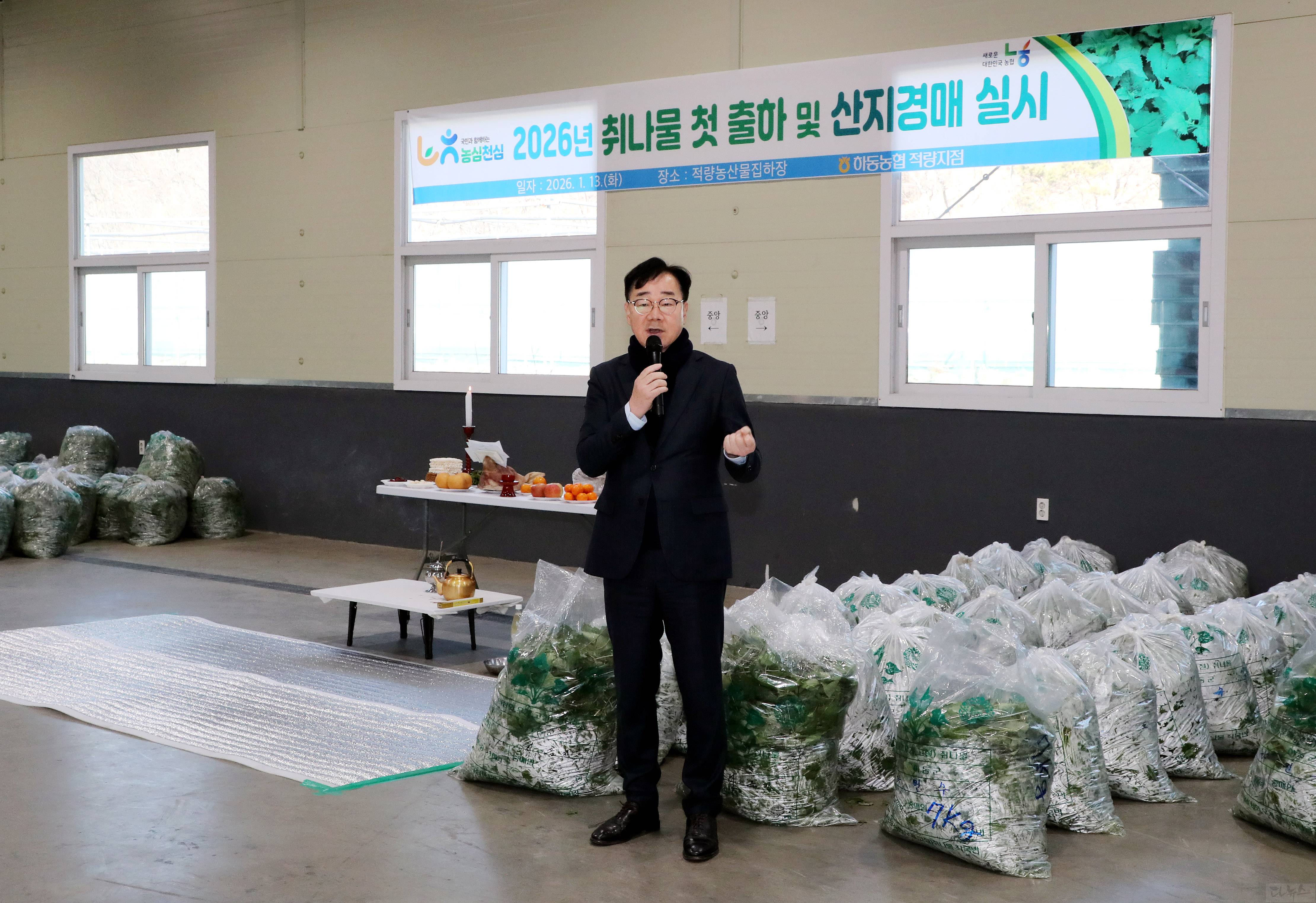 하동군은 지난 13일 하동농협 적량지점 산지유통센터에서 하승철 하동군수, 정영섭 하동군의회 부의장, 장주익 농협중앙회 하동군지부장, 지역 군의원, 취나물 재배 농가 등 60명이 참석한 가운데 ‘2026년 취나물 초매식 및 산지 경매’를 진행했다고 14일 밝혔다.
