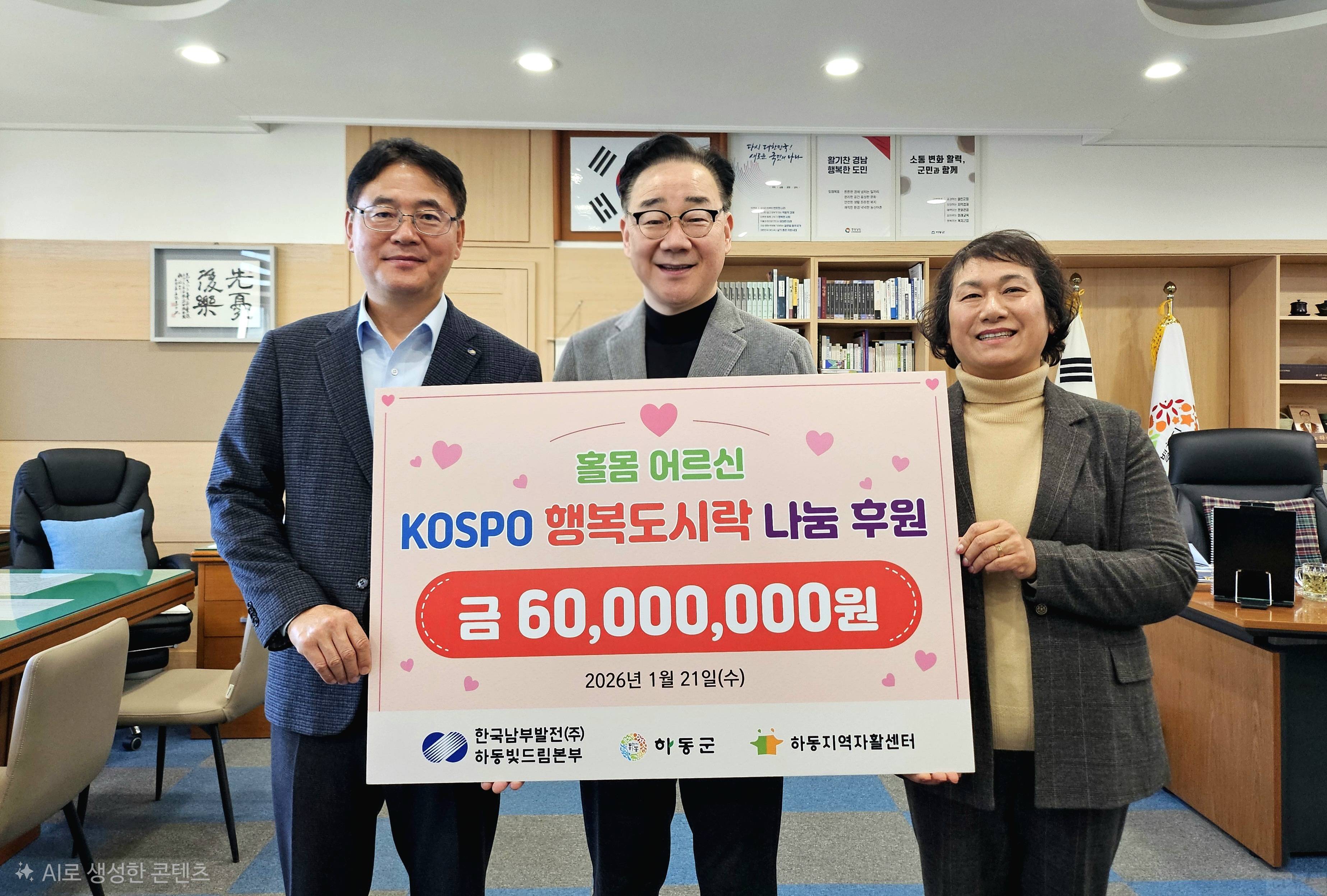 한국남부발전(주) 하동빛드림본부(본부장 이영재, 이하 하동본부)는 1월 21일(수) 하동군청에서 KOSPO 행복 도시락 나눔 후원 전달식을 가졌다.