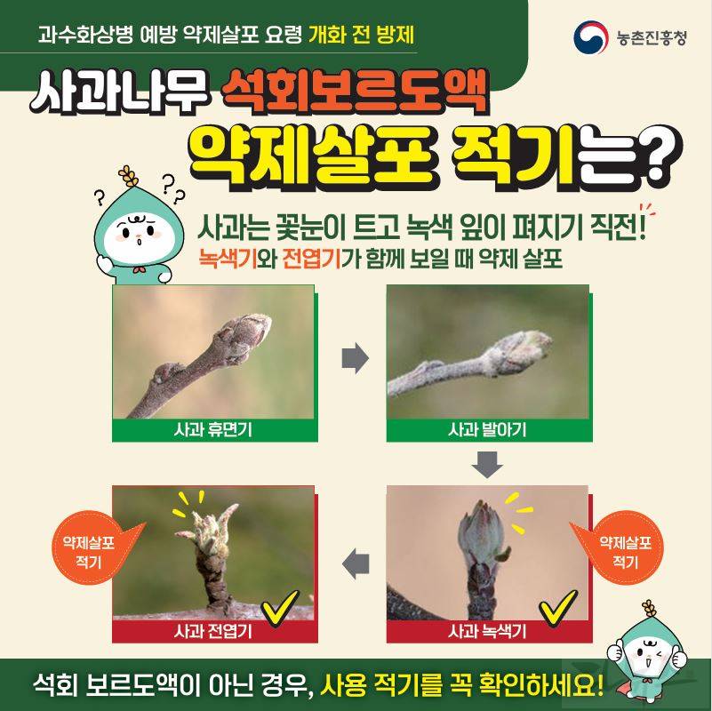 개화 전 방제는 배의 경우 꽃눈이 튼 직후, 사과의 경우 꽃눈이 트고 녹색 잎이 펴지기 직전에 실시해야 한다. 또한 과수의 생육 단계를 확인한 뒤 적기에 1차 약제를 살포해야 하며, 석회유황합제와 함께 살포할 경우 약해가 발생할 수 있어 석회유황합제 살포 후 최소 7일 이상의 간격을 두어야 한다.